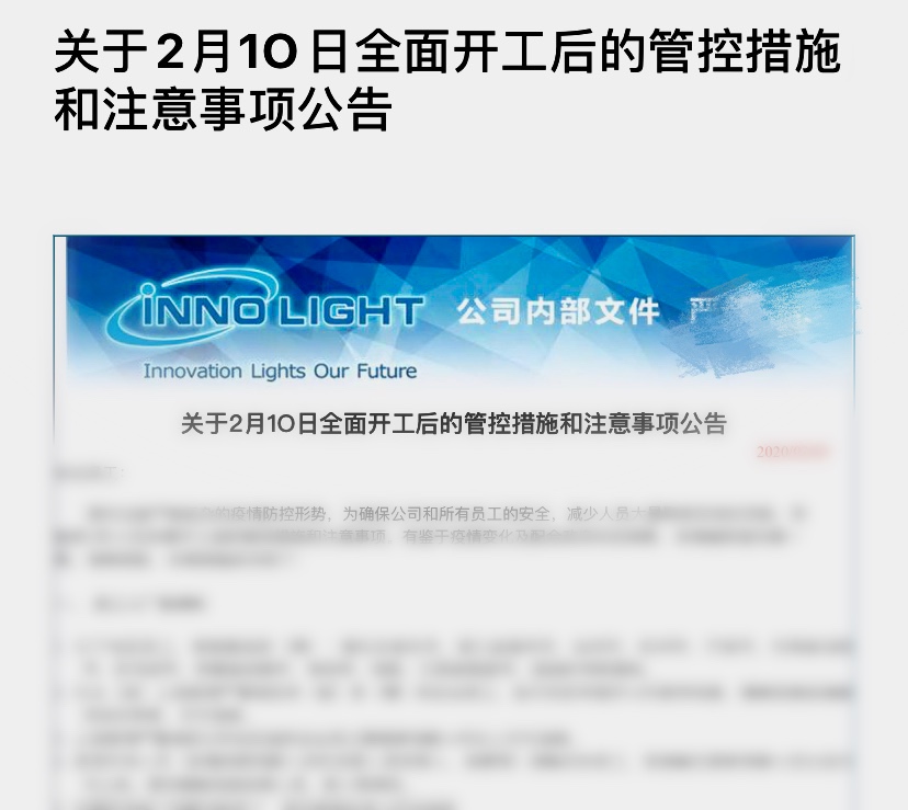 According to the epidemic prevention and control requirements for enterprises' resumption of work specified by the city and district, after review and approval by relevant departments, InnoLight Technology (Suzhou), and its subsidiary InnoLight Technology (Tongling), officially resumed work on February 10. In order to ensure safe operation and orderly work resumption, InnoLight Technology has taken various measures to strive for equal emphasis on production and epidemic prevention.