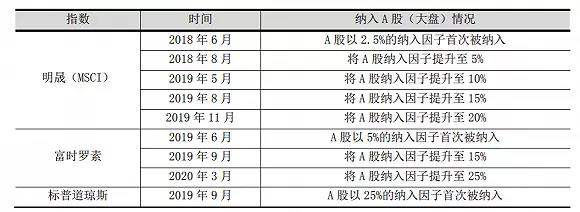 隨著金融業(yè)對外開放的不斷推進(jìn),明晟(MSCI)、富時(shí)羅素、標(biāo)普道瓊斯三大國際指數(shù)公司先后將A股納入其全球指數(shù)體系, 并相繼提高納入因子。